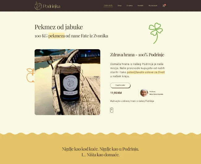 Web shop zdrave hrane inspirisan tradicijom Podrinja. Fokus je na toplom, prirodnom dizajnu koji odražava autentičnost proizvoda. Ključni izazov bio je istaknuti ručnu proizvodnju i lokalno porijeklo, što smo riješili kroz storytelling i vizuelni identitet.