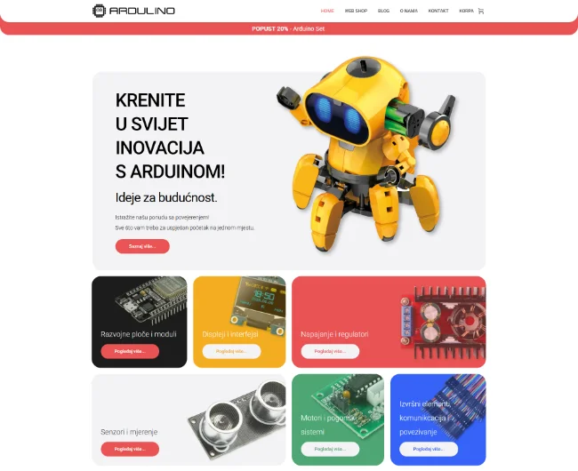 Specijalizirani web shop za Arduino entuzijaste i edukatore. Fokusirali smo se na jasnu kategorizaciju proizvoda i edukativni sadržaj. Glavni problem bio je olakšati snalaženje korisnicima različitih nivoa znanja, što smo riješili intuitivnom navigacijom i vodičima.